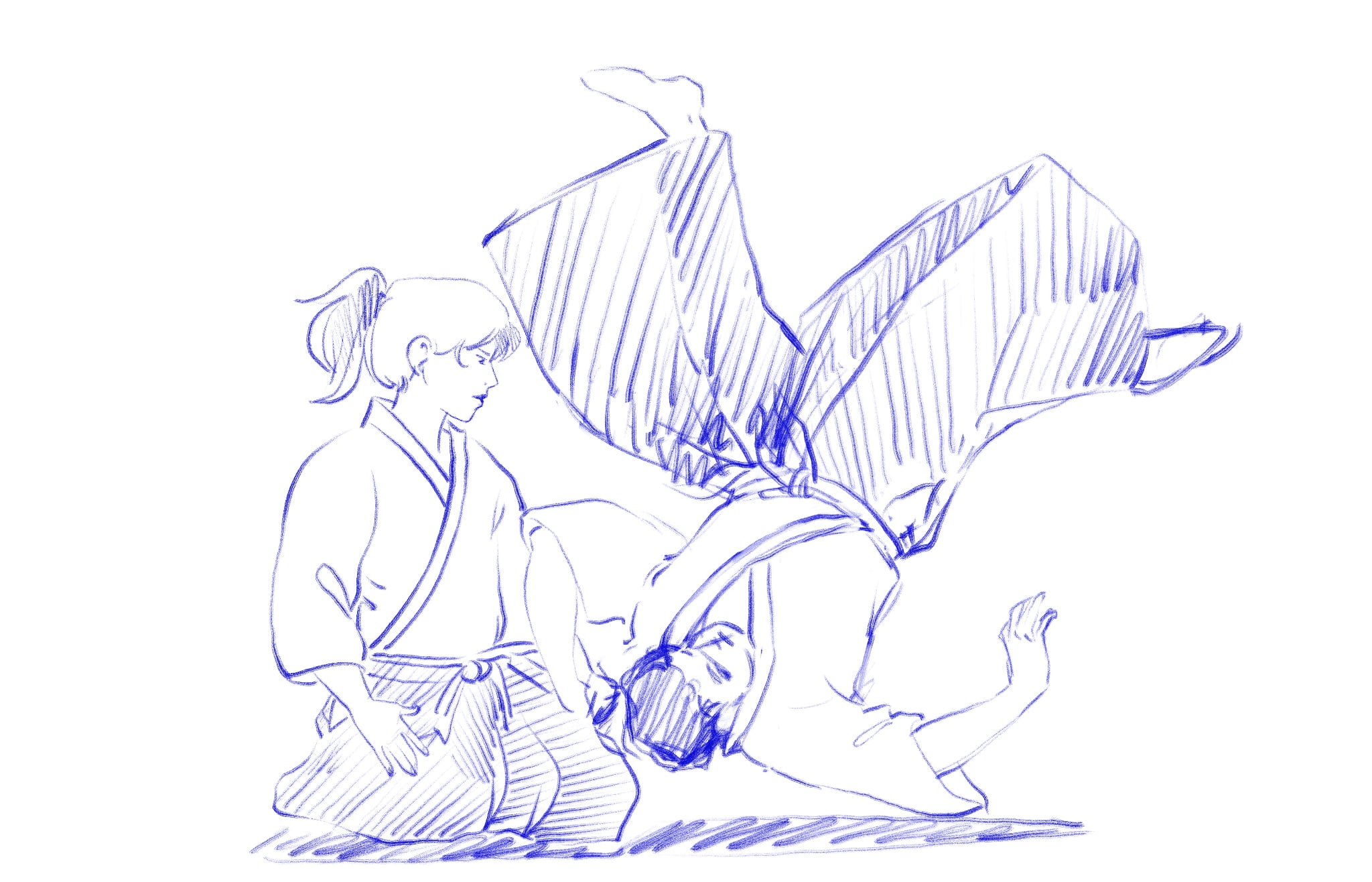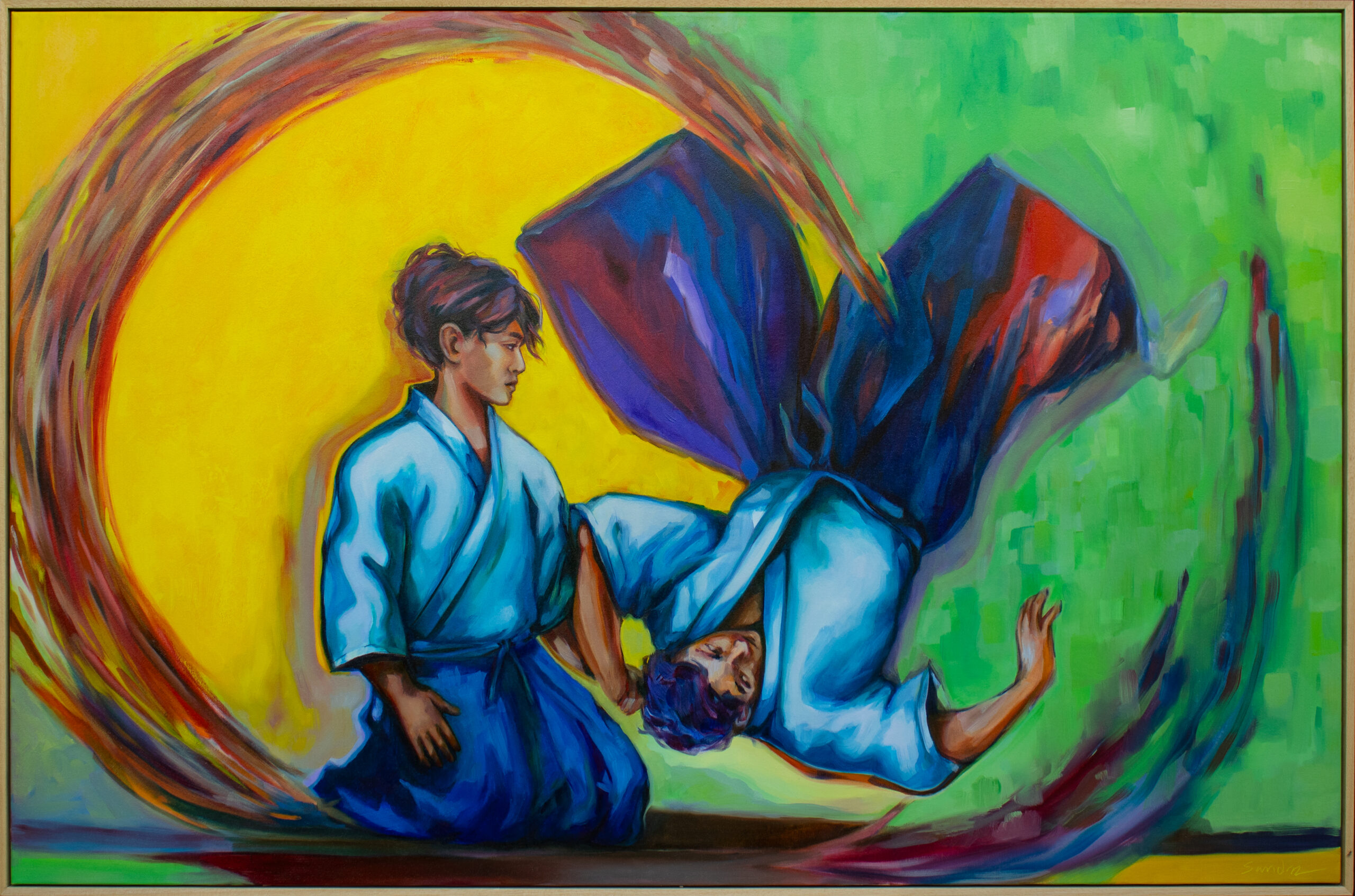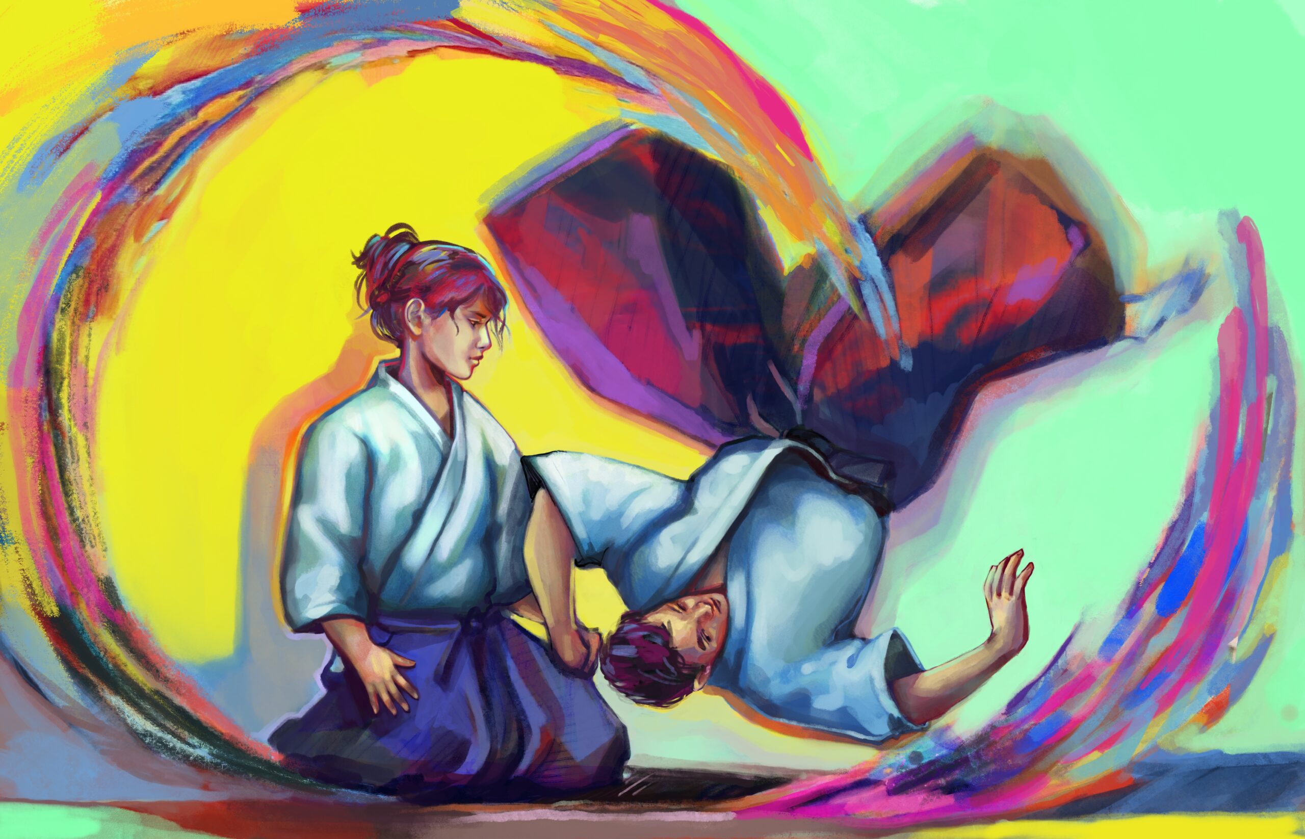 Mouvement de chute sur Hanmi Handachi waza Shihō-nage ura, spirale colorée coup de pinceau style calligraphie pour accentuer le mouvement sérénité des visages, un homme uke et une femme tori.